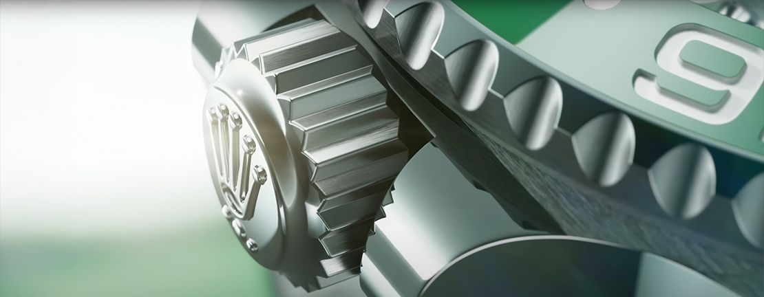A crown with a triple-lock indication (three dots: small-large-small) was shown, confirming white gold material. The bezel markings align with the GMT-Master II Sprite, pointing towards an upcoming white gold GMT Sprite, which differs from the typical Oystersteel GMT Sprite.
