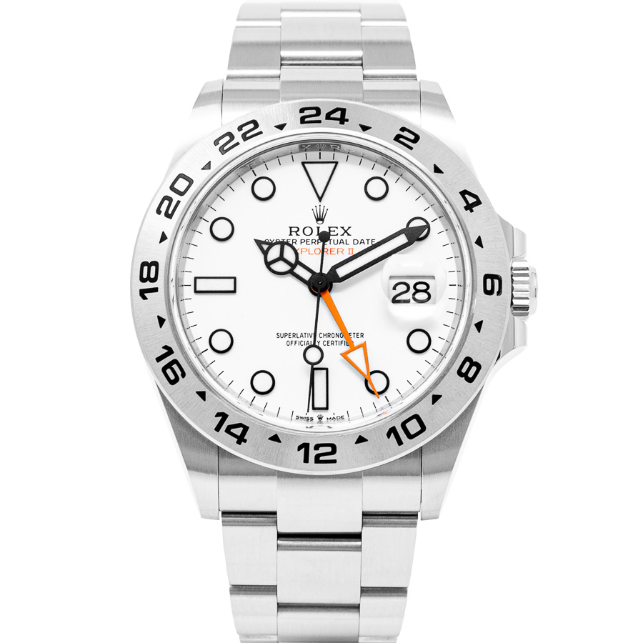 The Rolex Explorer II offers a 40mm or 42mm case size, date function, and an additional 24-hour hand GMT complication ideal for distinguishing day from night. It also features a fixed graduated bezel, enhancing its utility for tracking a second time zone or determining AM/PM in areas with no natural light.